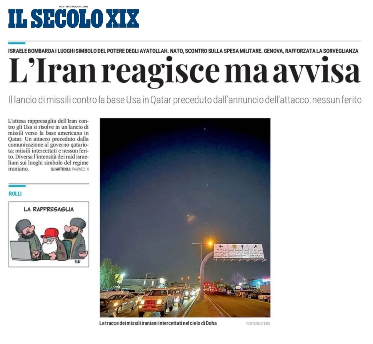 Ci sono tanti motivi per mettere a tutta pagina – oltretutto la prima – che “L’Iran reagisce ma avvisa”. Lo ha fato ieri il Secolo XIX, noto e glorioso quotidiano genovese di fondazione ottocentesca. Il primo motivo di quella scelta può risiedere in un ossequio all’esattezza di cronaca. Siccome l’Iran, prima della rappresaglia contro la base statunitense nel Qatar, ha avvisato che stava per lanciare l’attacco, allora tu dici che ha avvisato. Ma la cosa giustificherebbe semmai una parentesi in trafiletto, non un titolone a colonne plurime. Dunque deve trattarsi d’altro.