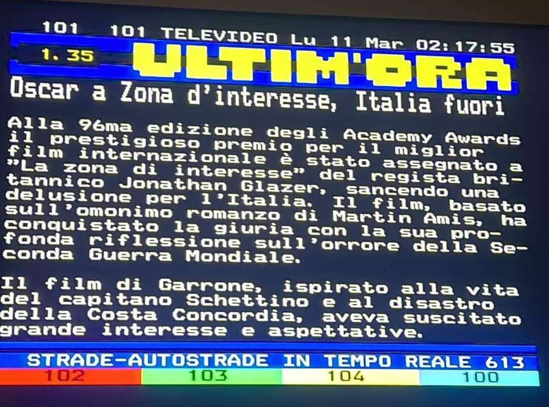 In un articolo in cui annuncia la vittoria de “La zona di interesse“, film Jonathan Glazer, adattamento del romanzo omonimo del 2014 scritto da Martin Amis, che racconta la vita quotidiana del comandante di Auschwitz e della sua famiglia in una villetta con piscina che confina con il muro del campo di sterminio, il servizio teletext della Rai che consente di trasmettere all’utente pagine di informazioni e servizi, sul televisore e online, se ne esce con una gaffe già virale sui social.