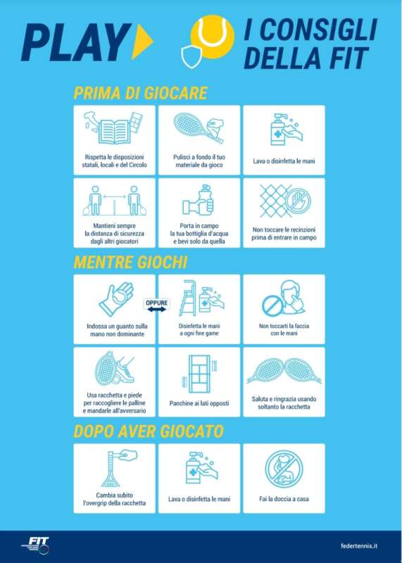 – Fare in modo che gli operatori addetti ai campi evitino rigorosamente di toccare le palle da tennis a mani nude. Anche se non ci sono prove scientifiche della capacità specifica del virus di essere trasmesso attraverso di esse, è noto che i “droplet” infetti possono sopravvivere per molte ore sulle superfici con le quali vengono a contatto.