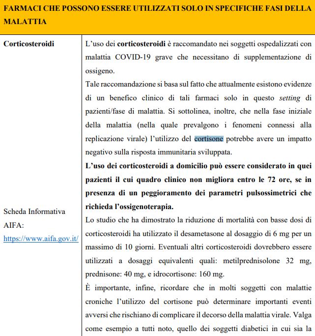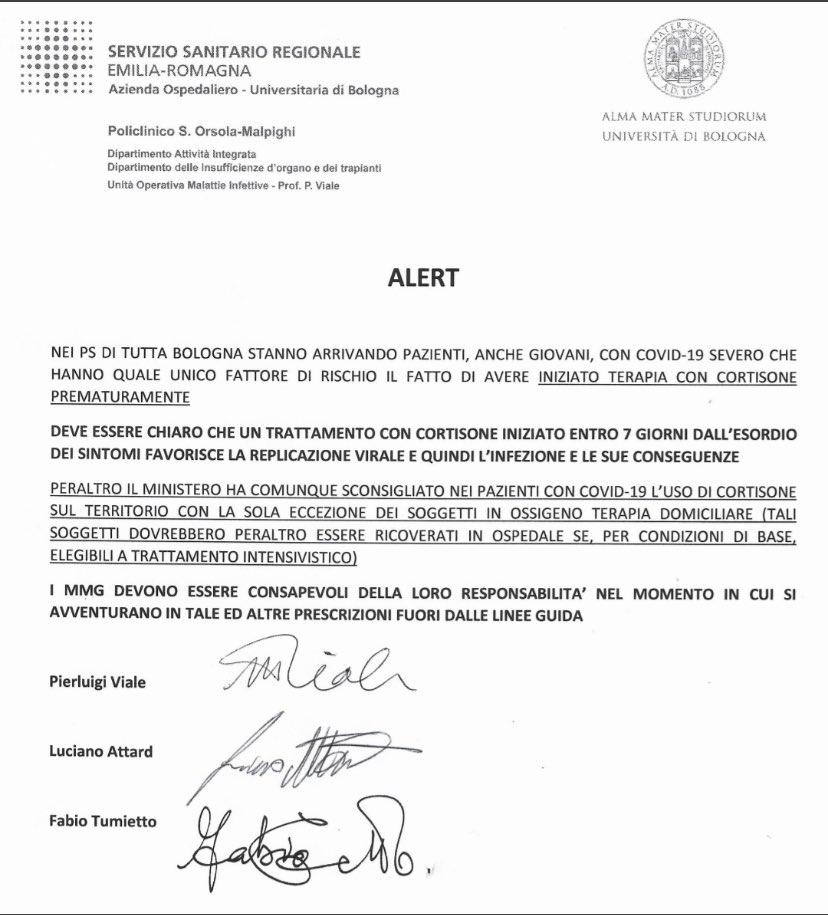 Gli infettivologi del Sant’Orsola citano in merito anche le direttive del Ministero della Salute, che sconsigliano l’uso del cortisone con la sola eccezione “dei soggetti in ossigenoterapia domiciliare”, soggetti che peraltro dovrebbero essere ricoverati in ospedale “se, per condizioni di base, eleggibili a trattamento intensivistico”.