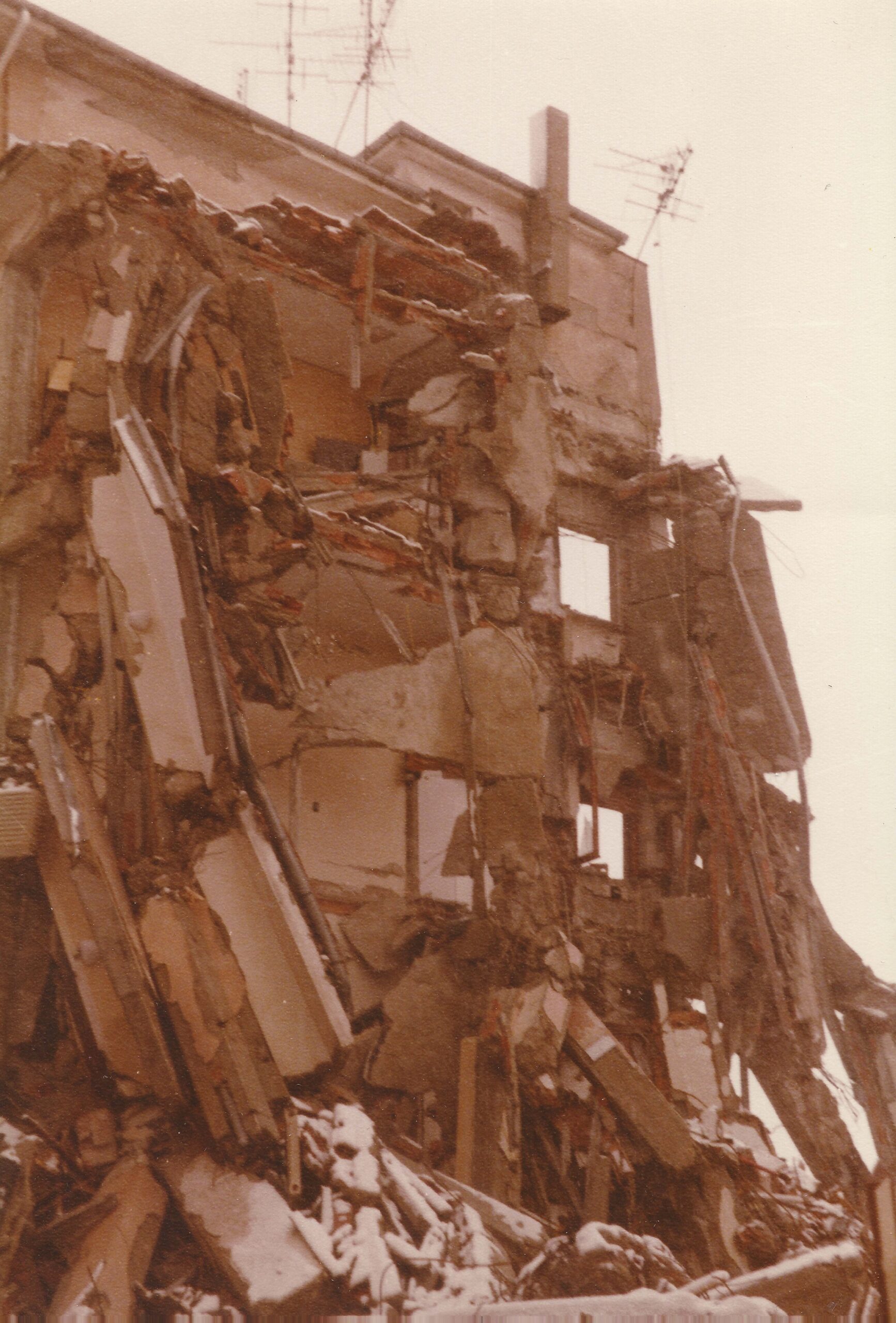 Al mattino arrivarono i primi soccorsi. I sopravvissuti iniziarono a cercare i propri cari e a scavare con qualsiasi cosa trovassero in strada. “Arrivarono i militari ma se ne andarono subito – dissero – non avevano nulla per scavare, e iniziarono ad aiutare chi si poteva estrarre. A metà mattinata riuscirono a tirare fuori Maria. Io rimasi sotto perché la gamba era bloccata sotto un pilastro. Un medico mi disse anche che voleva tagliarmi la gamba. Non volli assolutamente. Avevo sete, tantissima sete, per tutta quella polvere. Ma non c’era nemmeno acqua. L’unica cosa che i miei soccorritori trovarono fu una bottiglia di cognac miracolosamente scampata alla distruzione e così placai un pochino l’arsura”.
