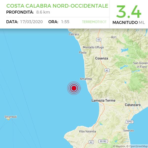 Il terremoto è stato avvertito nelle città (e relative province) di Cosenza, Catanzaro e Vibo Valentia. L’epicentro è in mare a una profondità compresa tra gli 8 e i 20 chilometri. Dall’1.47 (2.5 la magnitudo a una profondità di 26 chilometri) alle 2.02 (3,5 la magnitudo a una profondità di 9 chilometri), passando per l’1,52 (3.9 la magnitudo a una profondità di 33 chilometri) e l’1,55 (3.4 la magnitudo a una profondità di 9 chilometri), i cittadini calabresi delle zone presenti sulla costa tirrenica hanno avvertito le quattro scosse.