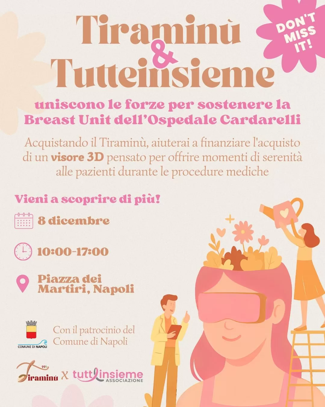 Lunedì 8 dicembre l’Associazione “TUTTEinsieme” e il 991 Bistrot in Piazza dei Martiri per distribuire il Tiraminù (Tiramisù artigianale prodotto e distribuito da 991 Bistrot). Gli incassi saranno devoluti interamente alla Breast Unit dell’Ospedale Cardarelli di Napoli.