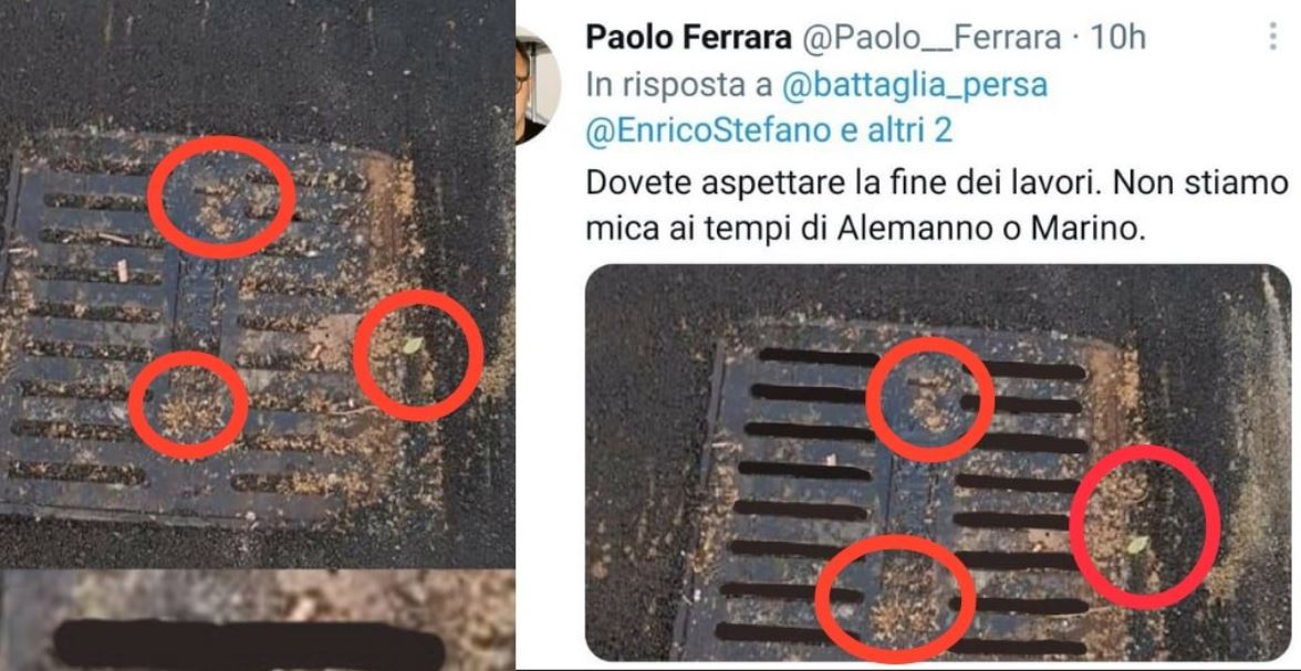Al tweet Ferrara ha risposto con una foto del tombino che appare pulito e con un commento il consigliere ironizza: “Dovete aspettare la fine dei lavori. Non siamo mica ai tempi di Alemanno o Marino”, è la stoccata del grillino Ferrara.