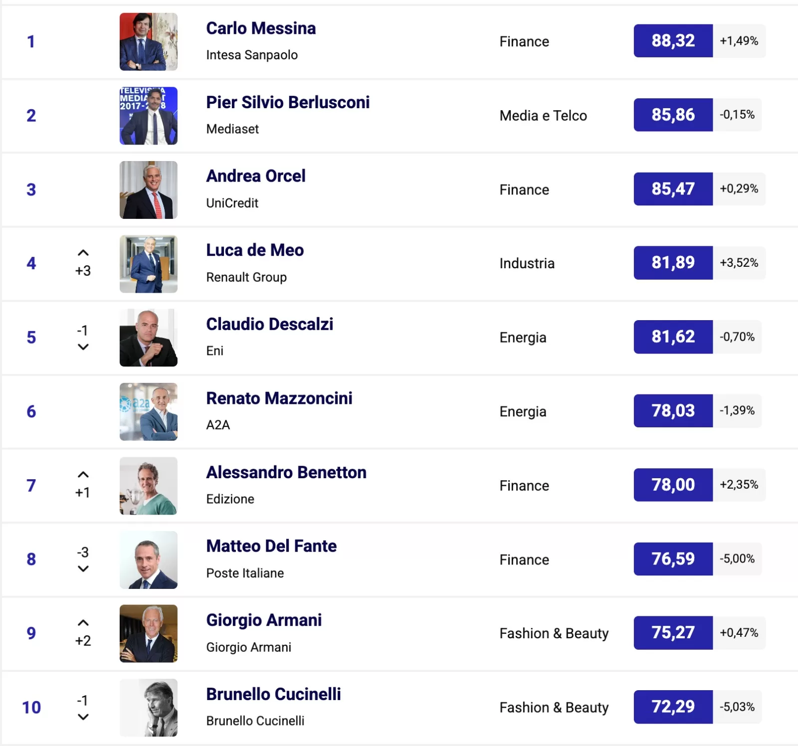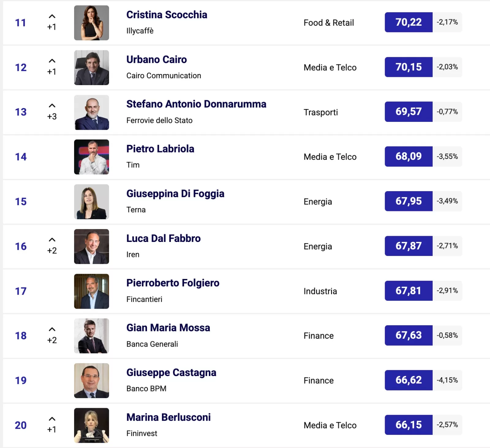 Al settimo sale di uno Alessandro Benetton (78) con il suo nuovo libro “Mai fermi”, poi Matteo Del Fante (76.59), Giorgio Armani (75.27) e Brunello Cucinelli (72.29). Salgono di uno Cristina Scocchia (70.22) e Urbano Cairo (70.15). Al tredicesimo sale di tre l’AD di FS Stefano Donnarumma (69.57), che firma il rinnovo del contratto ferrovieri e l’accordo con Cotral per integrare bus e treni. Stabili Pietro Labriola (68.09) e Giuseppina Di Foggia (67.95) Al sedicesimo sale di due il Presidente di Iren Luca Dal Fabbro (67.87) con il suo libro “Proteggere il futuro”.