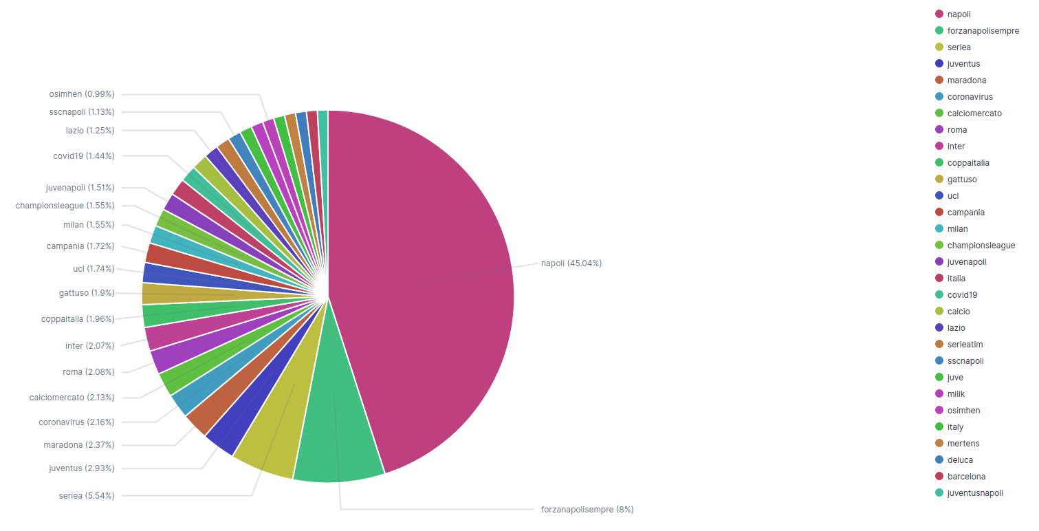 Non c’è da stupirsi se a Napoli si è parlato più di calcio, giocato e mercato, e più di Maradona e meno di Coronavirus e Covid. Queste due parole messe insieme raggiungono appena il volume dei tweets che hanno riguardato la morte del Pibe de Oro. E la classifica degli hashtags è eloquente. Se con napoli abbiamo naturalmente il primato, Forzanapoli sempre è il motto quotidiano che anima gli appassionati di calcio e la seriea, terza, rappresenta l’arena dove ci si sfida con l’odiata Juventus. Sono bastati 3 giorni a Maradona per superare nelle classifiche il male dell’anno Coronavirus. Gattuso è l’argomento scelto tra gli utenti come hashtag riferito alla squadra, juvenapoli è la partita più seguita e il caso Milik ha destato più interesse di Osimhen. Il 2020 è stato l’anno horribilis per molti, ma la morte di Maradona ha destato più dispiacere a una città che, nel bene e nel male, ha sempre ripiegato le proprie speranze sul calcio anche senza il suo dio a cui ha intitolato lo stadio. Il dato preoccupante però è che la politica, rappresentata da De Luca in questo caso, si provi in fondo alla classifica. Realtà distopica quella partenopea oppure disinteressata dopo anni di mancanze politiche e promesse non mantenute alla città?