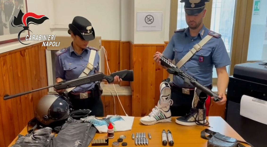 I carabinieri, coordinati dalla Procura della Repubblica presso il Tribunale di Torre Annunziata, hanno individuato i due responsabili attraverso la visione di sistemi di videosorveglianza. Sono state perquisite anche le abitazioni e i veicoli dei due soggetti e sono state rinvenute e sequestrate una carabina ad aria compressa marca Striker-Atsan calibro 5,5, una replica di mitragliatrice marca Mm calibro 4,5 a gas, tredici ricariche gas, quarantadue cartucce a salve calibro 9, una confezione di pallini marca Asg e una confezione di piombini marca Polimag.