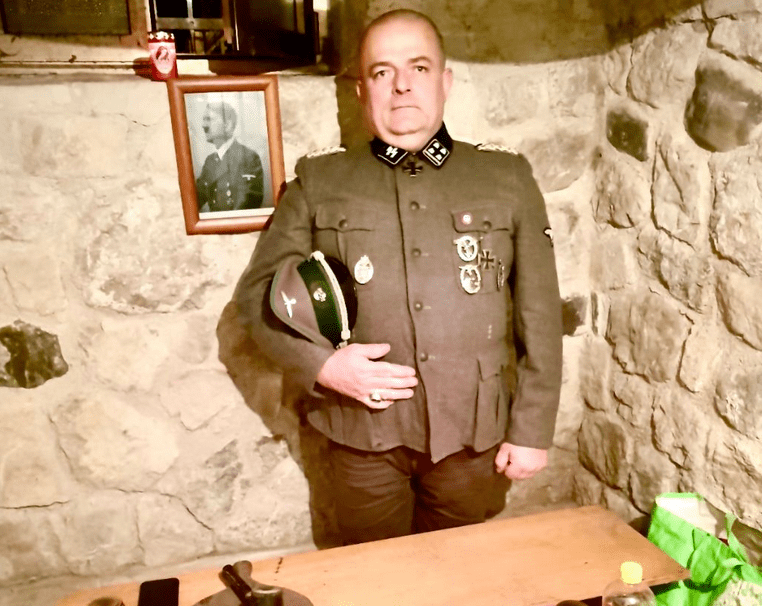 E ancora, a scanso di ulteriori equivoci: «Abbiamo comunque chiesto a Vaccarin di togliere immediatamente il nome del partito al gruppo consiliare del comune di Nimis”. Salvo smentite dovremmo trovarci «nell’ambito delle rievocazioni storiche» (sic). Nel dominio dei suoi sogni, l’obersturmbannführer Vaccarin, come uniforme quasi fedelmente testimonia, si immagina, appunto, tenente colonnello, insignito di Croce di Ferro di II Classe, Croce di Cavaliere, Distintivo del Partito Nsdap, ossia nazista, e ancora in possesso, lì sull’uniforme, d’altre insegne che sembrano, almeno a distanza, appartenere forse ai tiratori scelti o magari alla Luftwaffe, l’arma area di Goering. Sul tavolo, imbandito con un vessillo degli uomini scelti di Himmler, dietro al quale l’uomo si mostra austero, troviamo tre ceri votivi, di quelli rivestiti di plastica rossa, roba da santuario, una vera pecca; se infatti il nostro avesse ben studiato, così da giungere alla perfezione filologica avrebbe dovuto mostrare semmai la “Julleuchter”, la Lanterna di Yule, simbolo-onorificenza del processo di scristianizzazione vagheggiato dagli appartenenti all’Ordine Nero, da accendere per il solstizio d’inverno, il 21 dicembre. Ma forse non è il caso di sottilizzare.