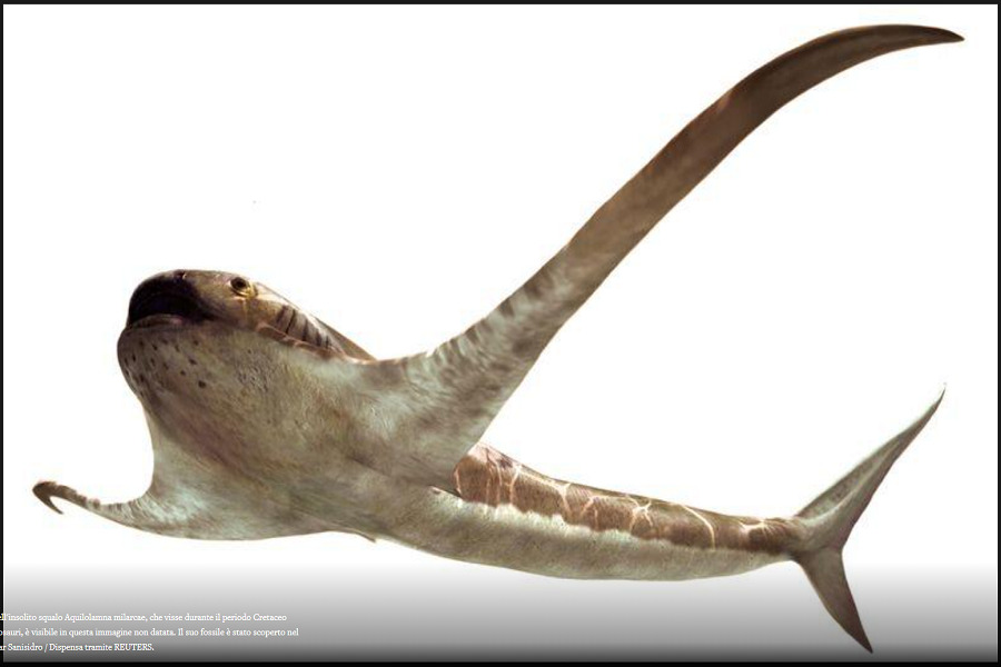 Circa 93 milioni di anni fa, nelle nostre acque nuotava uno squalo che come caratteristica particolare aveva le pinne ad ala allungate che rendevano l’animale più largo di quanto fosse lungo. La scoperta di Aquilolamna che significa squalo aquila è avvenuta lo scorso giovedì quando degli scienziati del Messico nord-orientale hanno annunciato la scoperta di un fossile quasi completo dell’animale marino. Il fossile è stato portato alla luce nello stato messicano di Nuevo Leon. Lo squalo aquila ha vissuto durante il periodo Crataceo condividendo la terra con i dinosauri. Come loro, anche le dimensioni dello squalo erano particolari. Infatti aveva due pinne di due metri e dalla testa alla coda era lungo 165 centimetri.