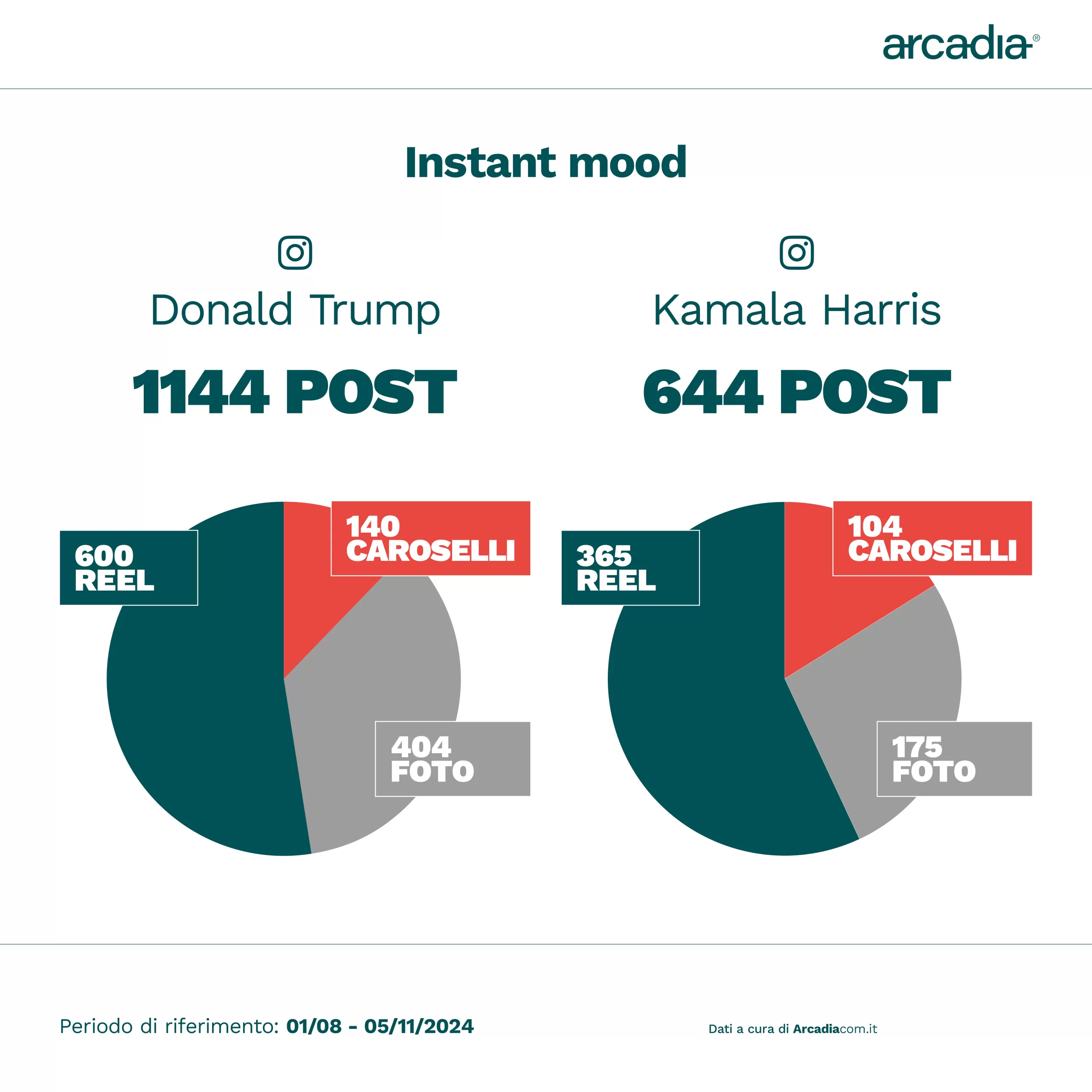 Così l’account Instagram di Trump, dall’1 agosto al 5 novembre (giorno del voto), ha pubblicato la bellezza di 1.144 post di cui però il 52,5% (parliamo di 600 contenuti) è reel. Nell’ultimo mese di campagna elettorale, giusto per dare un ulteriore dato della capacità di questi contenuti di calamitare l’attenzione, la media delle visualizzazioni dei reel è stata di 14.547.116, decisamente meglio di qualunque altro passaggio televisivo. Ancora meglio ha fatto Kamala Harris: nello stesso periodo sull’account Instagram della candidata democratica sono stati postati 644 contenuti, di cui 365 (pari al 56,6% del totale) sono dei reel. La media delle visualizzazioni della dem ovviamente è più bassa anche per il minor numero di follower che seguono l’account, ma resta in ogni caso una media invidiabile. Infatti solo nell’ultimo mese ogni reel è stato visto mediamente 8.353.307 volte.