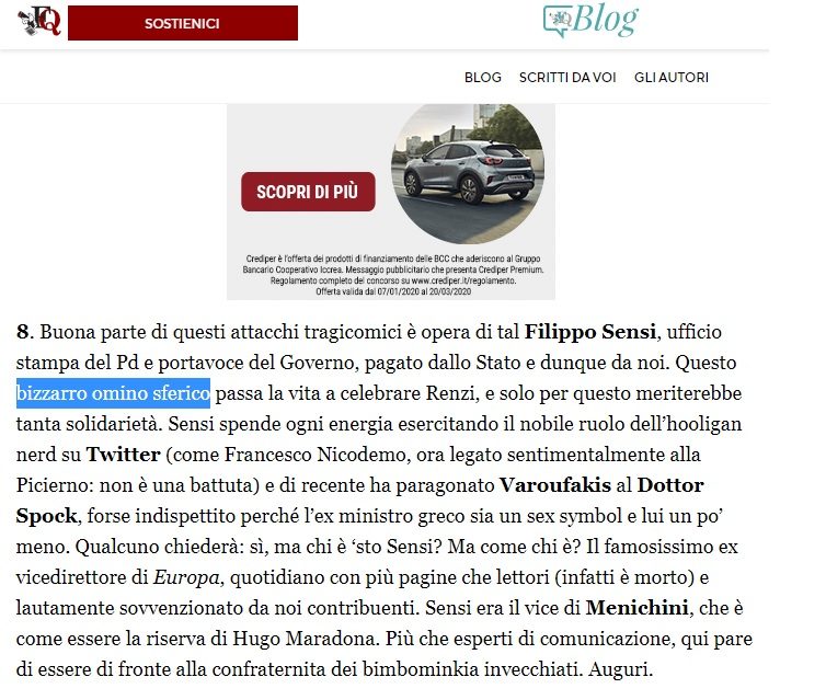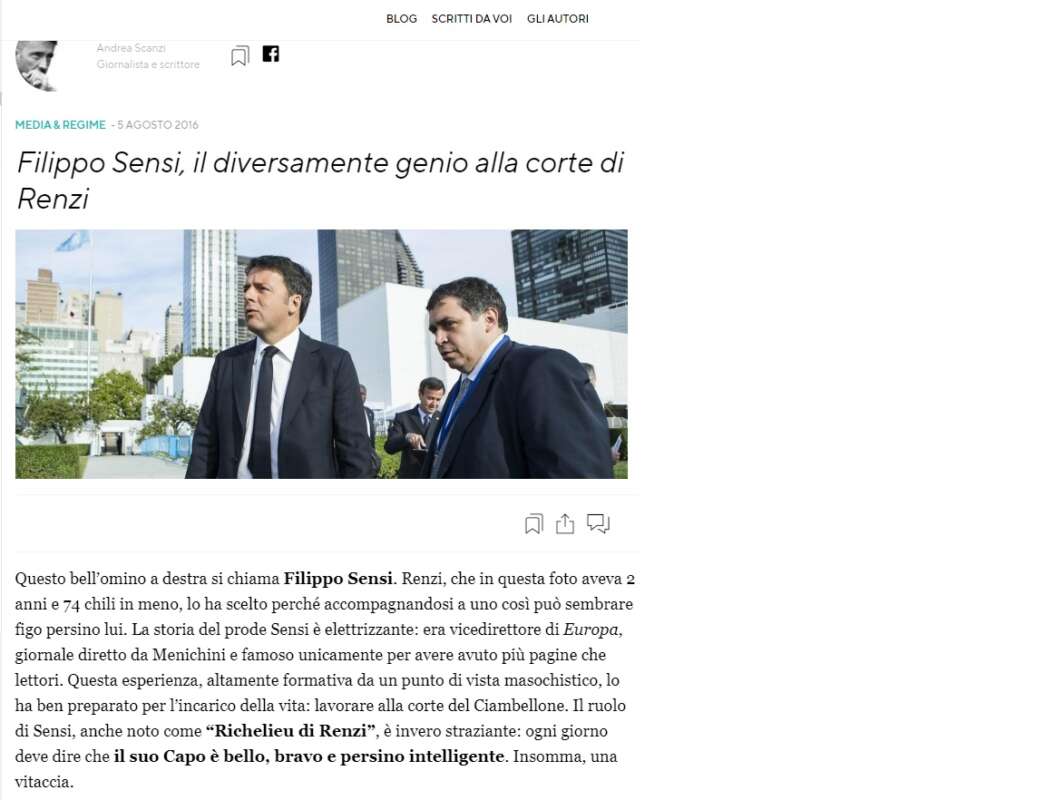 In un articolo sul Fatto Quotidiano, Scanzi definiva Sensi, che allora ricopriva l’incarico di portavoce del presidente del Consiglio Matteo Renzi, con queste parole vergognose: “Bizzarro omino sferico”. Un’indecenza per chiunque, ma in particolare per chi è giornalista e viene puntualmente invitato come commentatore nelle principali trasmissioni televisive di informazione, a partire da quelle del servizio pubblico. Dopo quell’episodio, la Rai ingaggiò Scanzi addirittura come ospite fisso del “Processo del Lunedì” su Rai3 e giurato di Sanremo.