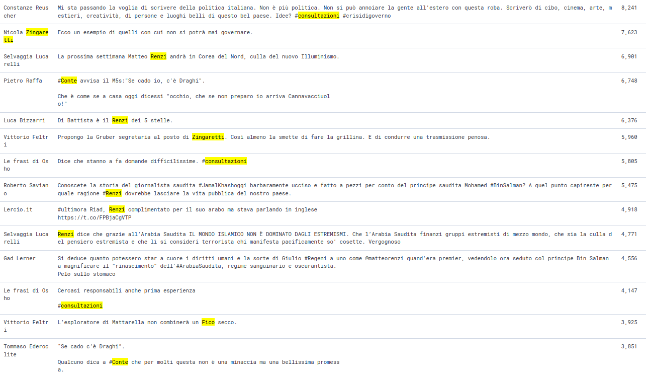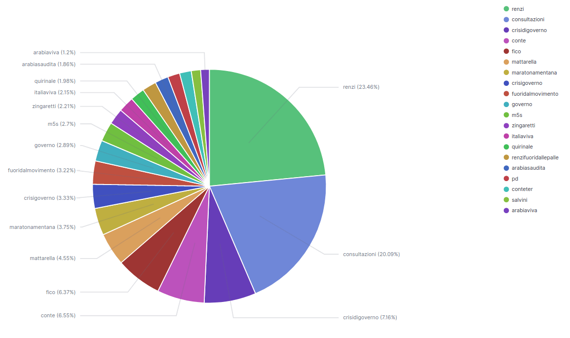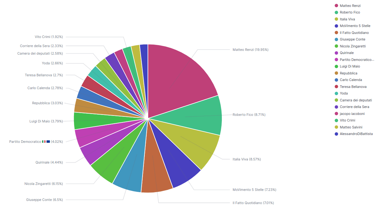 Tra le tendenze della settimana figura al primo posto #Renzi e questo la dice lunga sull’orientamento non proprio positivo nei confronti del leader di Italia Viva. A tenere banco come argomento astratto, invece, ci sono consultazioni e crisidigoverno. Giuseppe Conte e Fico sono sullo stesso piano di rilevanza per il pubblico social, unitamente a Sergio Mattarella. Verso la fine della top 20, Conteter ha maggiore spazio di Salvini onnipresente anche se non è stato ricercato, ma gli hashtag #fuoridalmovimento e #renzifuoridallepalle sono indicativi di un malessere generale dei sostenitori del governo gialloviola nei confronti di chi destabilizza l’operato dell’attuale maggioranza di governo.