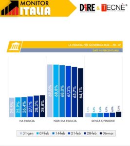 LA FIDUCIA NEL GOVERNO – L’emergenza Coronavirus, secondo quanto attestato da Tecnè, sta aumentando la fiducia nell’esecutivo di Giuseppe Conte. Nell’ultima quest’ultima è cresciuta di mezzo punto al 28,8%, mentre è calata di più di un punto la quota di chi non ha fiducia (64,1%).