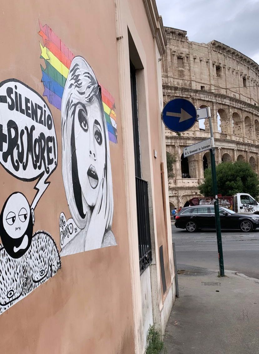 Il volto di Raffaella Carrà con l’inconfondibile caschetto, i colori arcobaleno e una scritta “Meno silenzio, più rumore”. È il soggetto di un murale apparso qualche giorno in via di San Giovanni in Laterano, la Gay street romana a due passi dal Colosseo. Il ricordo della cantante e show girl, scomparsa il 5 luglio scorso dopo aver lottato contro una malattia, è l’ennesimo segnale di una città pronta a mostrare il proprio lato inclusivo verso la comunità Lgbtq+, vittima di discriminazioni e violenze e al centro del dibattito politico per l’approvazione del Ddl Zan, il disegno di legge contro l’omotransfobia.