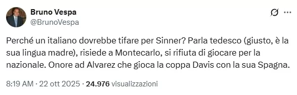 A cavalcare il rifiuto alla Nazionale di Jannik Sinner c’è anche Bruno Vespa che abbraccia tutti gli stereotipi possibili per condannare il campione altoatesino. “Perché un italiano dovrebbe tifare Sinner? Parla tedesco (giusto, è la sua lingua), risiede a Montecarlo, non gioca per la nazionale in Coppa Davis per prendersi una settimana di vacanza in più. Onore ad Alcaraz che scende in campo per la sua Spagna”. Questo il Vespa-pensiero pubblicato due volte su X perché, a distanza di poche ore, arriva la rettifica al primo commento dopo essersi reso conto che lo spagnolo Carlos fa di cognome Alcaraz e non Alvarez.