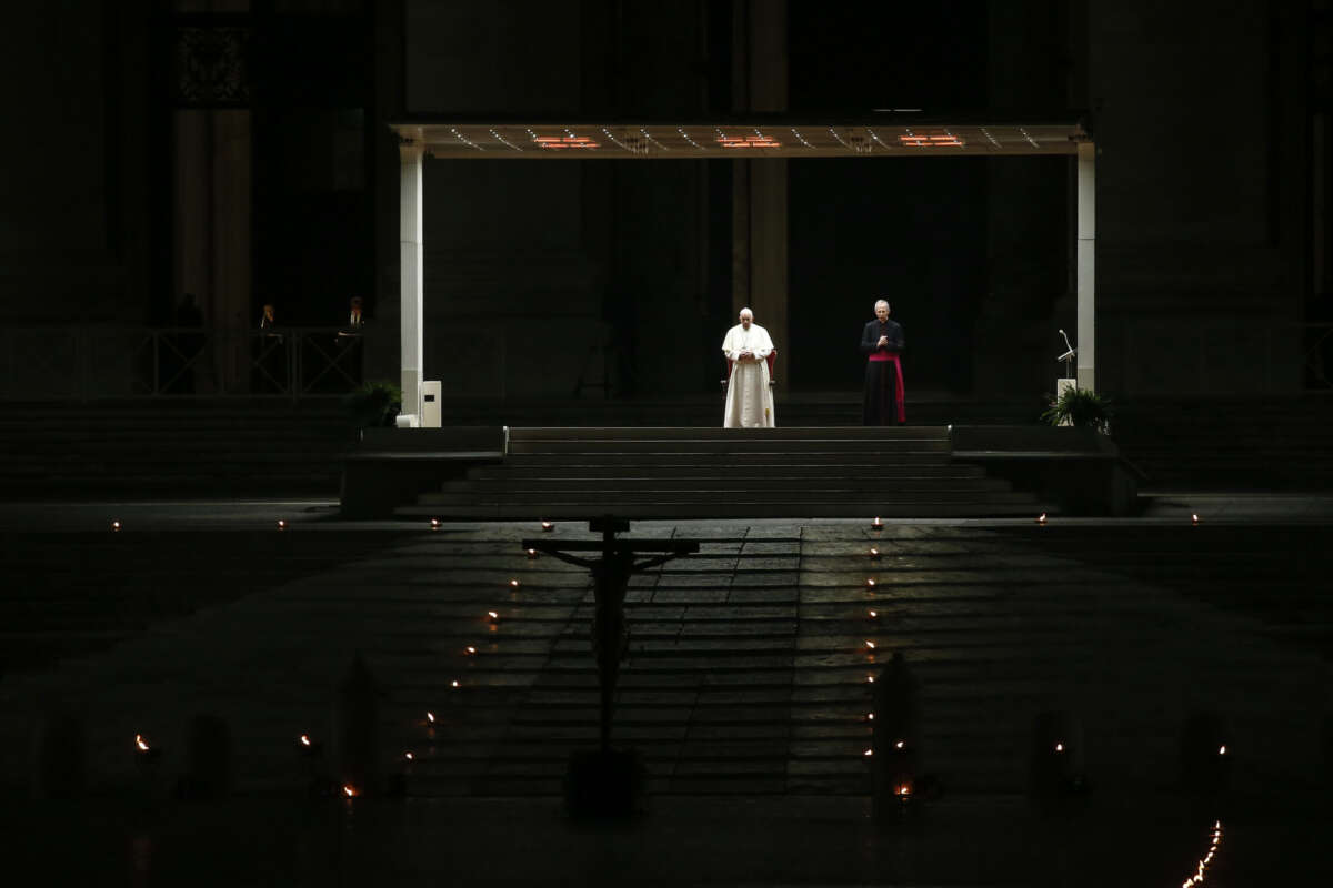Piazza San Pietro è deserta. Il percorso delle 14 stazioni è segnato da fiaccole. La Via Crucis è trasmessa in diretta in mondovisione ma i maxischermi sono spenti per evitare assembramenti. A portare la croce sono Michele, ex detenuto e oggi piccolo imprenditore, il direttore dei Due Palazzi di Padova Claudio Mazzeo, il vicecommissario della Polizia Penitenziaria Maria Grazia Grassi, un agente di polizia, la volontaria Tatiana Mario e il cappellano don Marco Pozza. E poi medici e infermieri del Fondo Assistenza Sanitaria del Vaticano, in prima linea nelle cure ai pazienti affetti da coronavirus.