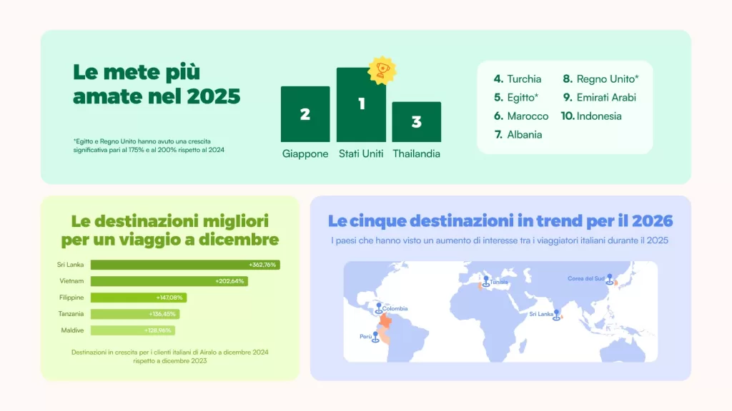 Le scelte di viaggio degli italiani raccontano molto più di una semplice classifica di destinazioni e finiscono per intercettare dinamiche economiche, tecnologiche e di consumo sempre più evidenti. È quanto emerge dai dati diffusi da Airalo, marketplace globale di eSIM con oltre 20 milioni di utenti, che fotografa un 2025 segnato da una forte propensione alla mobilità internazionale e da un’accelerazione netta verso soluzioni digitali per la connettività.
