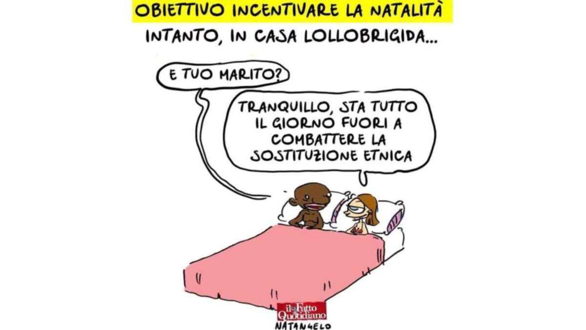 Ieri “Il Fatto” di Travaglio ha pubblicato una vignetta in prima pagina nella quale è disegnata la sorella di Giorgia Meloni a letto con un africano di pelle scura. L’africano le chiede: “E tuo marito?”. Lei risponde: “Tranquillo, è fuori a combattere la sostituzione etnica”. Il titolo della vignetta è: casa Lollobrigida. Le allusioni sono chiarissime. La sorella di Giorgia Meloni è anche la moglie del ministro Lollobrigida che nei giorni scorsi ha parlato del problema della sostituzione etnica.