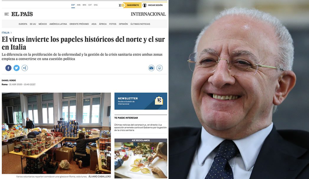 La descrizione del governatore affianca un articolo di Daniel Verdú , storico corrispondente ed esperto di affari italiani per il quotidiano spagnolo. Verdú descrive la spaccatura, o anche l'”iperbole”, un “cambio di paradigma”, l'”inversione di ruoli”, che l’emergenza coronavirus ha decretato tra il Sud e il Nord Italia. Le immagini degli studenti e dei lavoratori che scappano da Milano sono quelle di “un esodo al contrario”, ha scritto il giornalista. E le regioni del Nord, maggiormente colpite dal contagio, tutte in mano al centrodestra, hanno mostrato delle falle nei loro sistemi sanitari e quindi l’emergenza potrebbe trasformarsi anche in crisi politica per alcuni partiti; soprattutto per la Lega di Matteo Salvini.