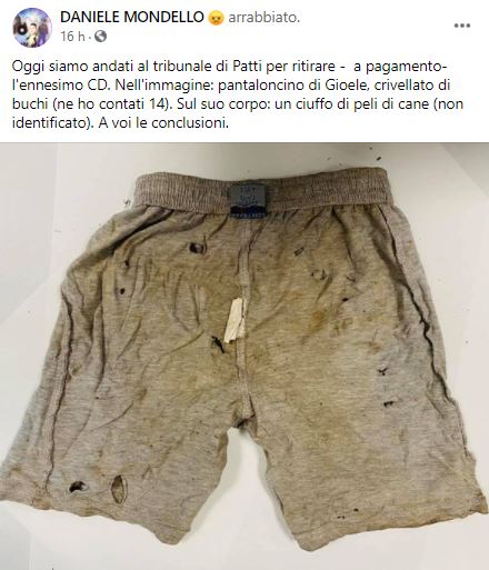 “Oggi siamo andati al tribunale di Patti per ritirare – a pagamento – l’ennesimo CD – ha scritto Mondello su Facebook postando la foto – Nell’immagine: pantaloncino di Gioele, crivellato di buchi (ne ho contati 14). Sul suo corpo: un ciuffo di peli di cane (non identificato). A voi le conclusioni”. E infatti in tanti, tantissimi si stanno lanciando in commenti, osservazioni e analisi del reperto. Mondello stesso continua a scrivere anche lui nei commenti: “Sangue”, cerchiando delle macchie sui pantaloncini, e “vedere questi pantaloncini … Vedere la maglietta a brandelli … Mi fa venire la pelle d’oca. Mi fa stare malissimo. Se c’è veramente un Dio … allora ti chiedo di farmi trovare la verità per favore”.