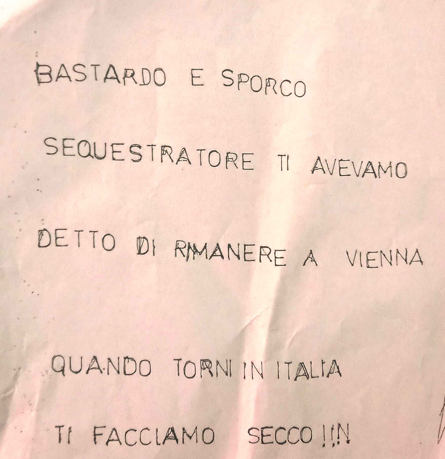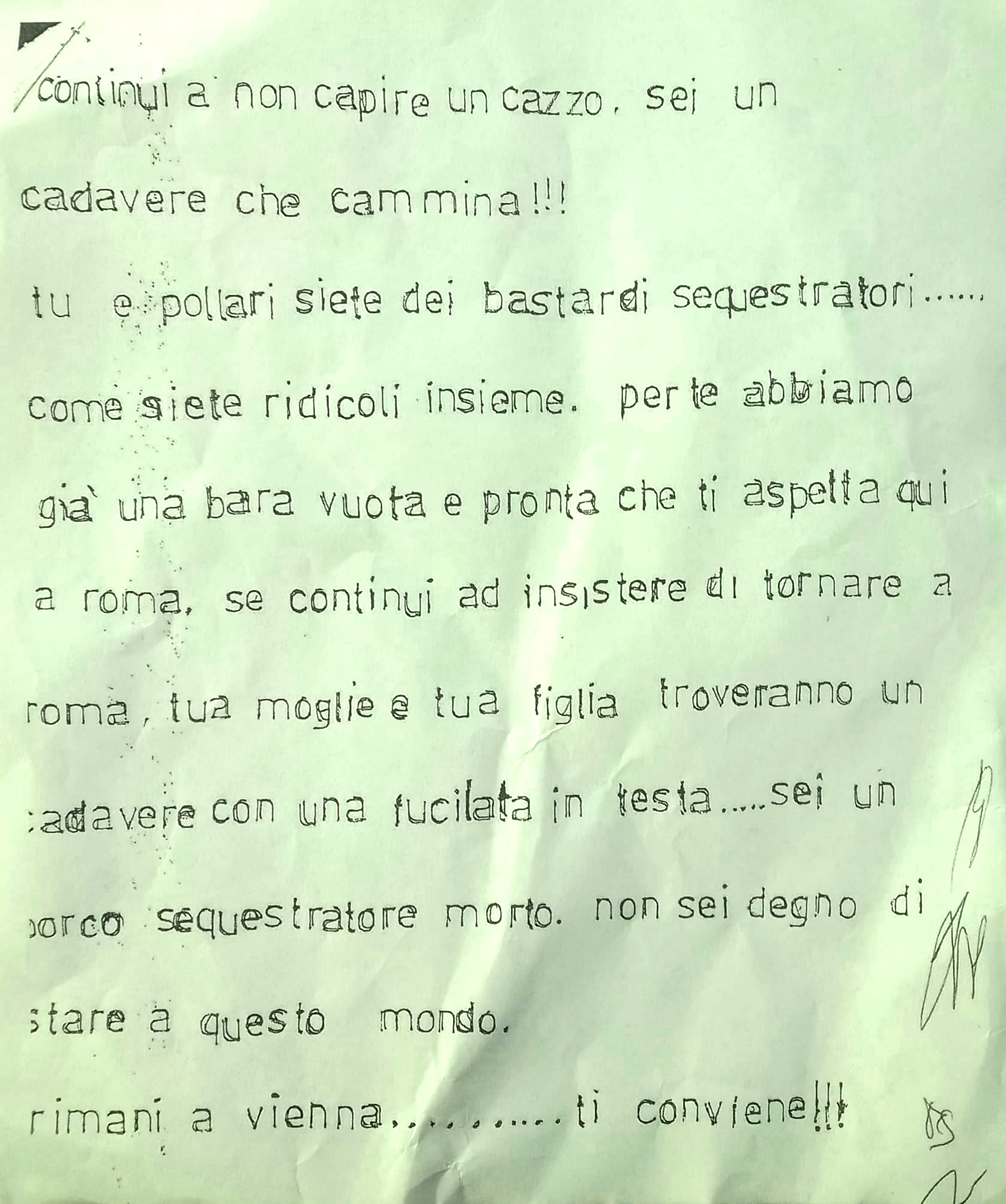 Ci mettono in mano due fogli. La fonte è un parlamentare del Copasir, che viola il segreto di Pulcinella che lì dovrebbe vigere, e in realtà serve solo a nascondere quello che si dovrebbe fare e non si fa, per pigrizia, quieto vivere, commercio di dare-avere con questa o quella cordata dei servizi segreti. Tutto è depositato presso il Copasir, e tutto è ed era a disposizione di Gabrielli e della Belloni. Prima però una busta. C’è il francobollo con Papa Luciani. Il nome e l’indirizzo privato, in Emilia-Romagna, del destinatario. Contenuto: una lettera che riproduciamo in questa pagina. Il sistema per non farsi identificare è quello antico dei rapitori sardi: il normografo. Dice il foglio, che segue a messaggi sul telefonino irrintracciabili, tutto in minuscolo: “Continui a non capire un cazzo, sei un cadavere che cammina!!! Tu e Pollari siete dei bastardi sequestratori… come siete ridicoli insieme. Per te abbiamo già una bara vuota e pronta che ti aspetta qui a Roma. Tua moglie e tua figlia troveranno un cadavere con una fucilata in testa….. sei un porco sequestratore morto. Non sei degno di stare a questo mondo. Rimani a Vienna…….. ti conviene!!!”. Siamo a inizio del 2014.