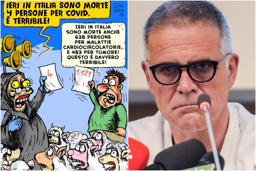 Il medico ha condiviso su Twitter una vignetta del fumettista Ghisberto, noto per le sue simpatie sovraniste e più volte criticato da stampa e web per vignette offensive. Nella vignetta un vestito di nero che, circondato da pecore e con alle spalle degli altoparlanti, esclama: “Ieri in Italia sono morte 4 persone per Covid. E’ terribile!”. Di fronte a lui, un altro uomo in abiti normali gli risponde: “Ieri in Italia sono morte anche 638 persone per malattie cardiocircolatorie e 483 per tumore! Questo è davvero terribile”.