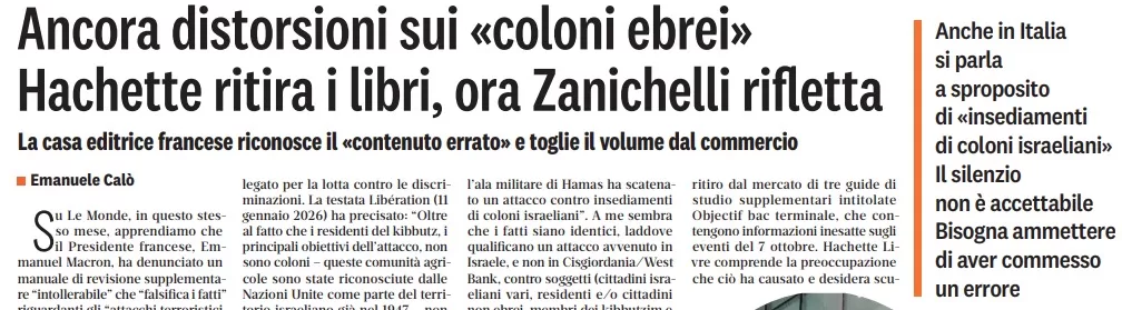 Dopo la denuncia del Riformista, Zanichelli corregge il passaggio sulle gravi imprecisioni sugli attacchi di Hamas del 7 ottobre 2023. L’intervento riguarda il volume La storia. Progettare il futuro, firmato da Alessandro Barbero, Chiara Frugoni e Carla Sclarandis. Il 27 gennaio avevamo pubblicato un’analisi di Emanuele Calò, che evidenziava come nel testo le vittime e le aree israeliane colpite fossero indicate come «coloni» e «insediamenti». Una formulazione distorta, perché riferita a località situate nel territorio internazionalmente riconosciuto di Israele.