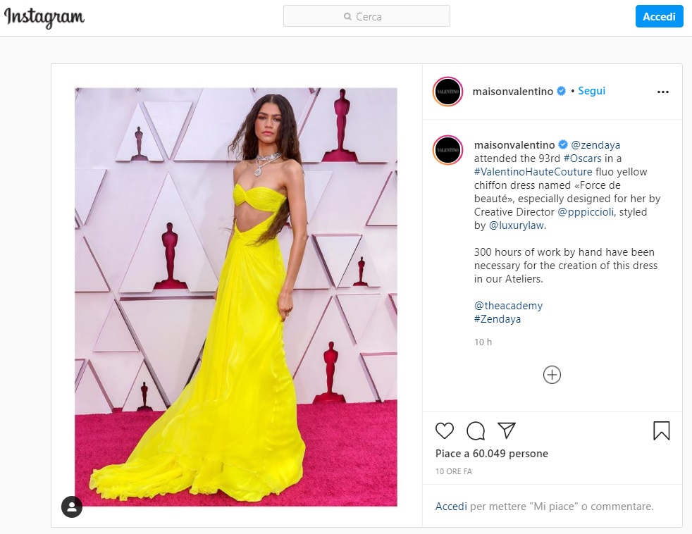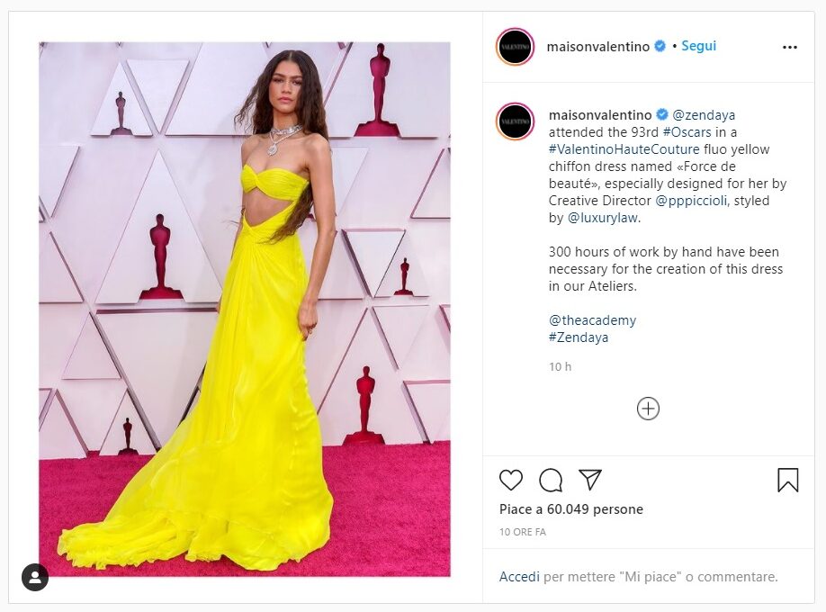 Ispirata a Cher, cantante e attrice degli anni 70 che nel suo programma televisivo dell’epoca The Sonny and Cher Show indossava un vestito molto simile a quello indossato ieri da Zendaya. A rendere il suo look spettacolare è stato lo stilista italiano Valentino. Il vestito dal nome Force de beauté fa parte della collezione Haute Couture. L’abito è stato progettato su misura proprio per l’attrice e come conferma lo stilista Valentino su Instagram, il suo direttore creativo Pierpaolo Piccioli e gli artigiani dell’azienda di moda italiana hanno impiegato 300 ore per produrlo.