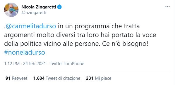 Oggi, il secondo atto dello Zingaretti confuso. Stavolta senza scusanti dovute alla fretta della diretta o all’impossibilità di cancellare quanto detto: no, oggi nero su bianco il leader del Pd ha scritto un tweet di elogio al lavoro giornalistico del programma televisivo “Non è la D’Urso”. Non Report, non Piazza Pulita, non Cartabianca: la trasmissione glitterata di Canale 5, quella che tra le sue ospitate ha vantato Angela da Mondello, la creatrice del tormentone “Non ce n’è coviddi”, o che ha prestato il fianco agli inseguimenti in elicottero a chiunque si facesse trovare all’aperto durante il primo lockdown.